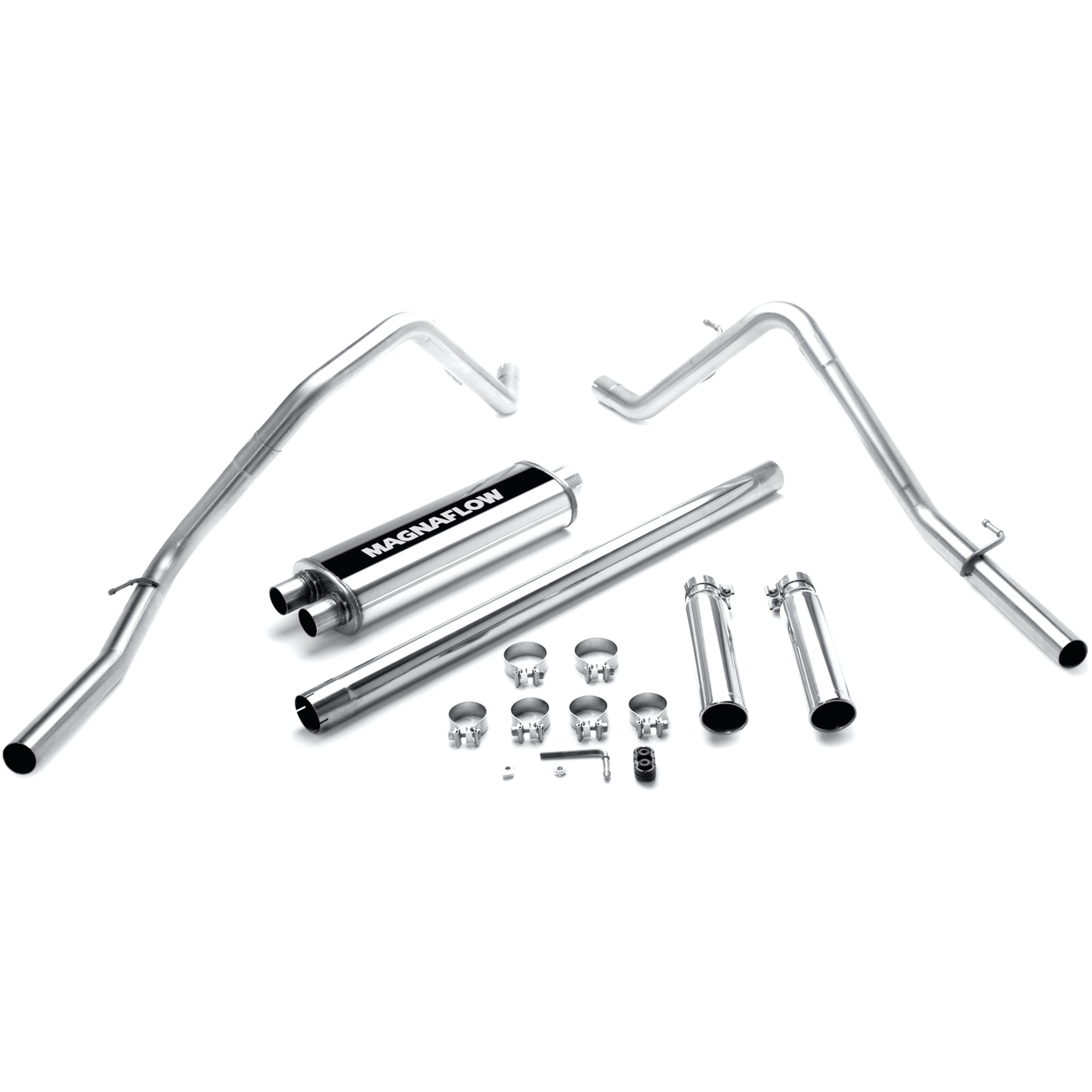 The MagnaFlow 2006-2007 Dodge Ram 1500 Street Series Cat-Back Performance Exhaust System brings out the personality of your 5.7L 2006-2007 Dodge Ram 1500 with our signature resonant, powerful engine tone and dyno-proven performance. Thanks to its fast-flowing, mandrel bent 3in. main piping and 1 Straight-Through mufflers ending in a Dual Split Rear exit with 3.5in. Polished Clamp-On Single Wall Angle Cut Rolled Edge tips, this Dodge Ram 1500 exhaust kit has the performance chops to match its sporty sound and appearance. Upgrade your ride to the next level with an exhaust that has the pipes to put other Dodge Ram 1500's to shame. With this system your vehicle will be producing Aggressive exterior and Moderate interior sound levels while leaving other cars and trucks feeling envious at every stoplight. Exhaust kit 16700 features a cat-back layout that replaces your ride's stock exhaust components from near the catalytic converter on back. Extensive 3D scanning during development has resulted in a direct-fit design that you can easily install yourself. 16700 is produced using CNC precision robotic manufacturing techniques and is backed by MagnaFlow's 1-year limited finish warranty and limited lifetime construction warranty. Product video