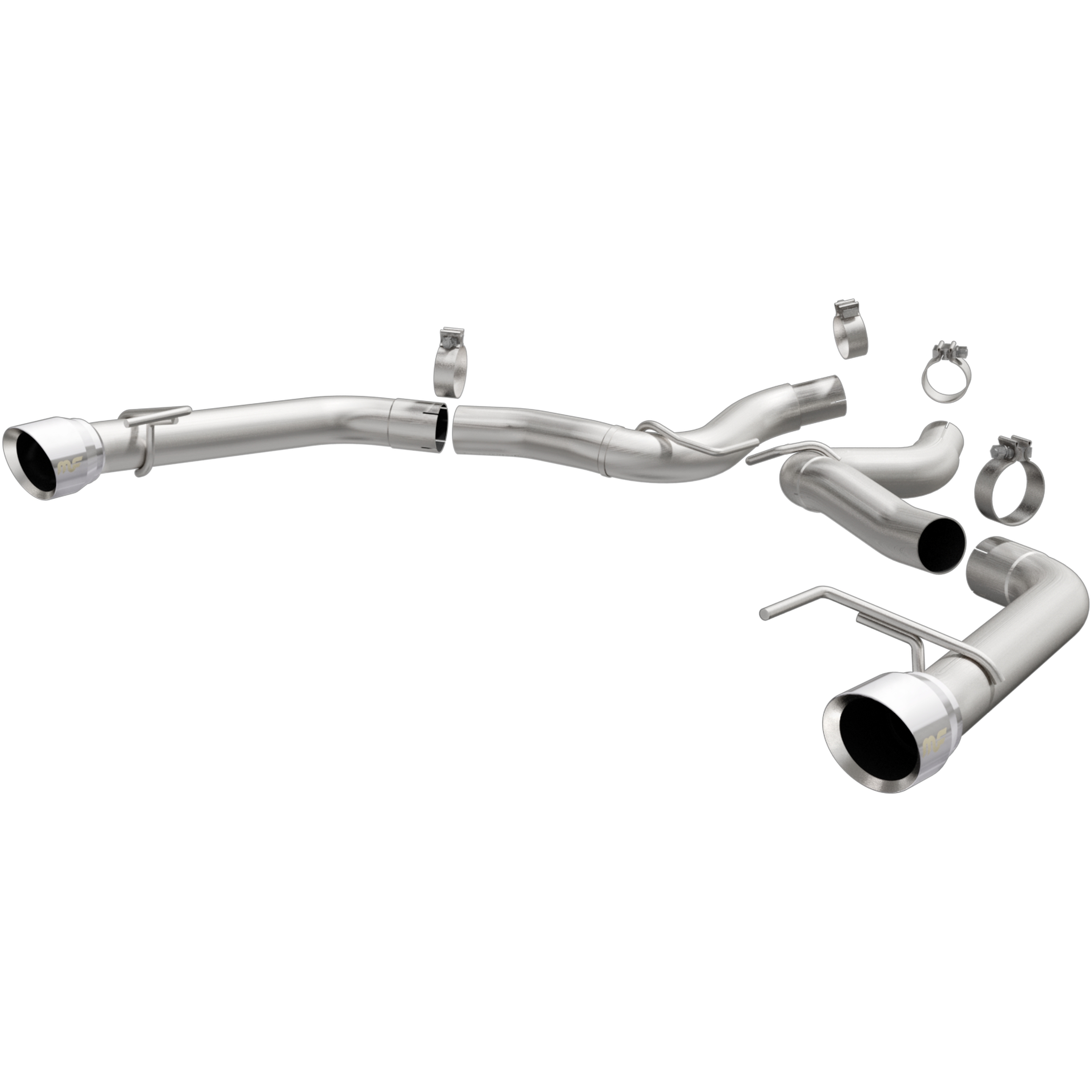The MagnaFlow 2015-2017 Ford Mustang Race Series Axle-Back Performance Exhaust System 19344 doesn't leave any performance on the table with a race-ready, light weight, dyno-proven design ready to help your 5.0L 2015-2017 Ford Mustang take on any pretenders, whether on the track or the street. Exhaust kit 19344 is engineered to produce our powerful, resonant signature exhaust note at Very Aggressive exterior and Aggressive interior sound levels with an axle-back layout that replaces your vehicle's exhaust components from near the rear axle on back. Please check to ensure compliance with local noise regulations. This Ford Mustang exhaust kit features fast-flowing mandrel bent 3in. diameter main piping that ends in a Dual Split Rear exit with 4.5in. Polished Welded-On Double Wall Angle Cut Folded Edge tips. Extensive 3D scanning during development and the use of advanced CNC precision robotic manufacturing techniques ensures that 19344's direct-fit design fits so perfectly that you can easily install the system yourself. The durable, corrosion resistant stainless steel construction of exhaust system 19344 is backed by MagnaFlow's limited lifetime warranty. Product video