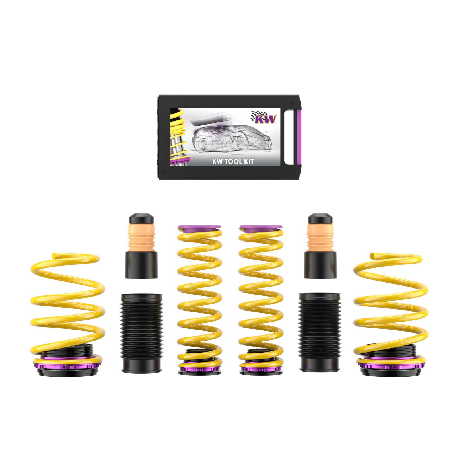 Your vehicle not only gets a more dynamic look with the KW height adjustable spring kit, but the steering behavior and response of the standard dampers becomes more agile. All driver assistance systems and comfort features of an adaptive series suspension remain with our vehicle specific developed spring set up.