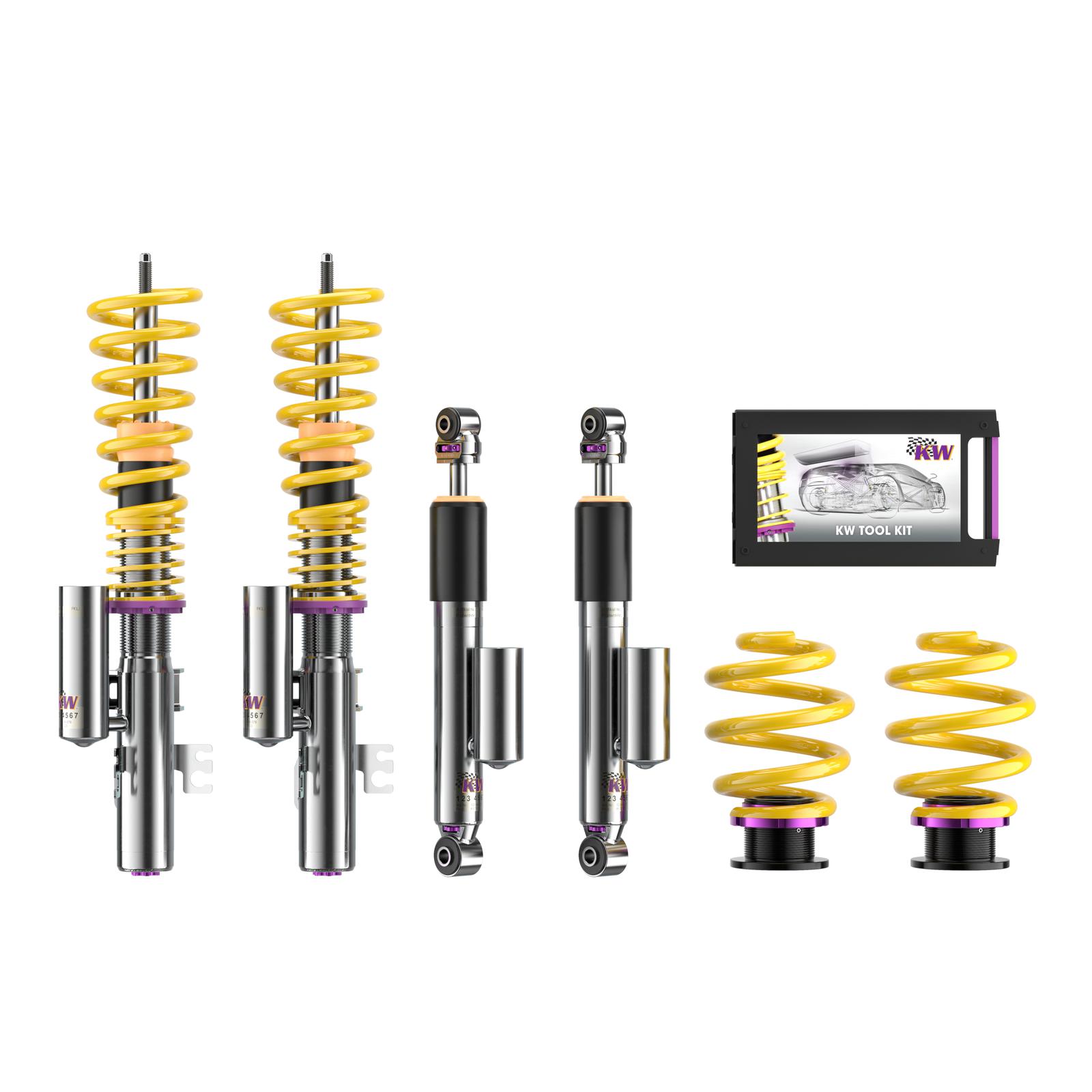 The KW coilover kit Variant 3 inox-line is the perfect accessory for performance-oriented drivers and tuning enthusiasts who put a great demand on their suspension. The separately rebound and compression damping adjustable dampers with their well-thought-through click adjustment allow a perfect setup. So it is easy to influence the steering behaviour, directional stability, tire grip and handling characteristics when driving on the limit.