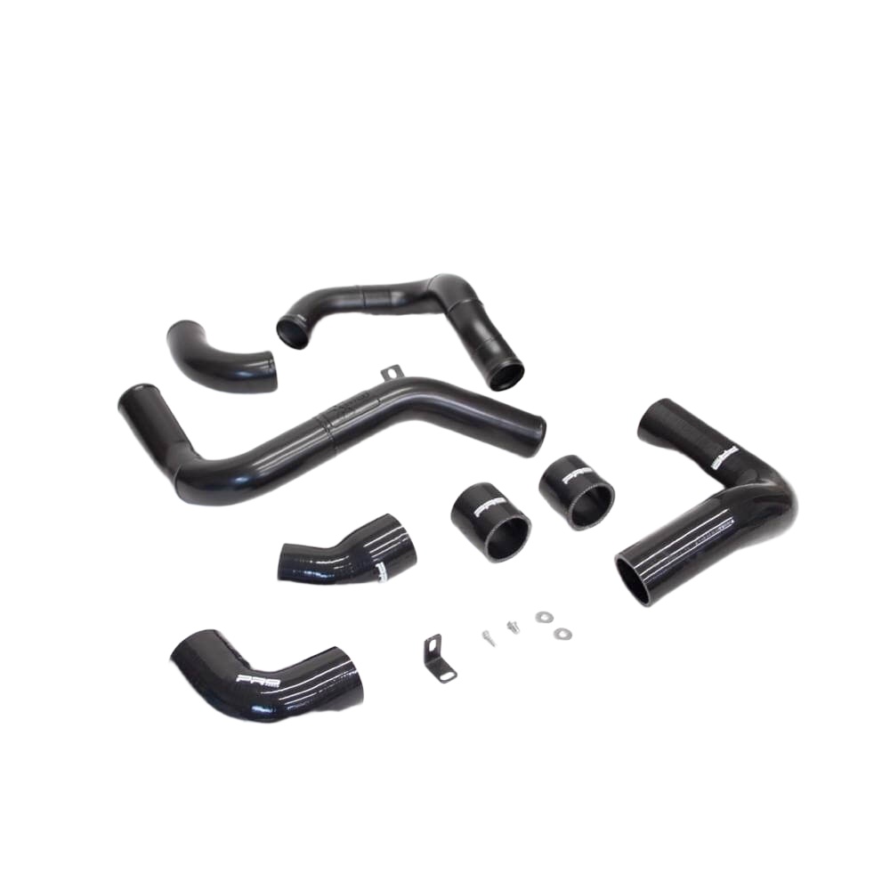 - Hot side (turbo to intercooler) is made from 2.5″ lightweight alloy and connected with Pro Hoses 5 ply silicone hose joiners.