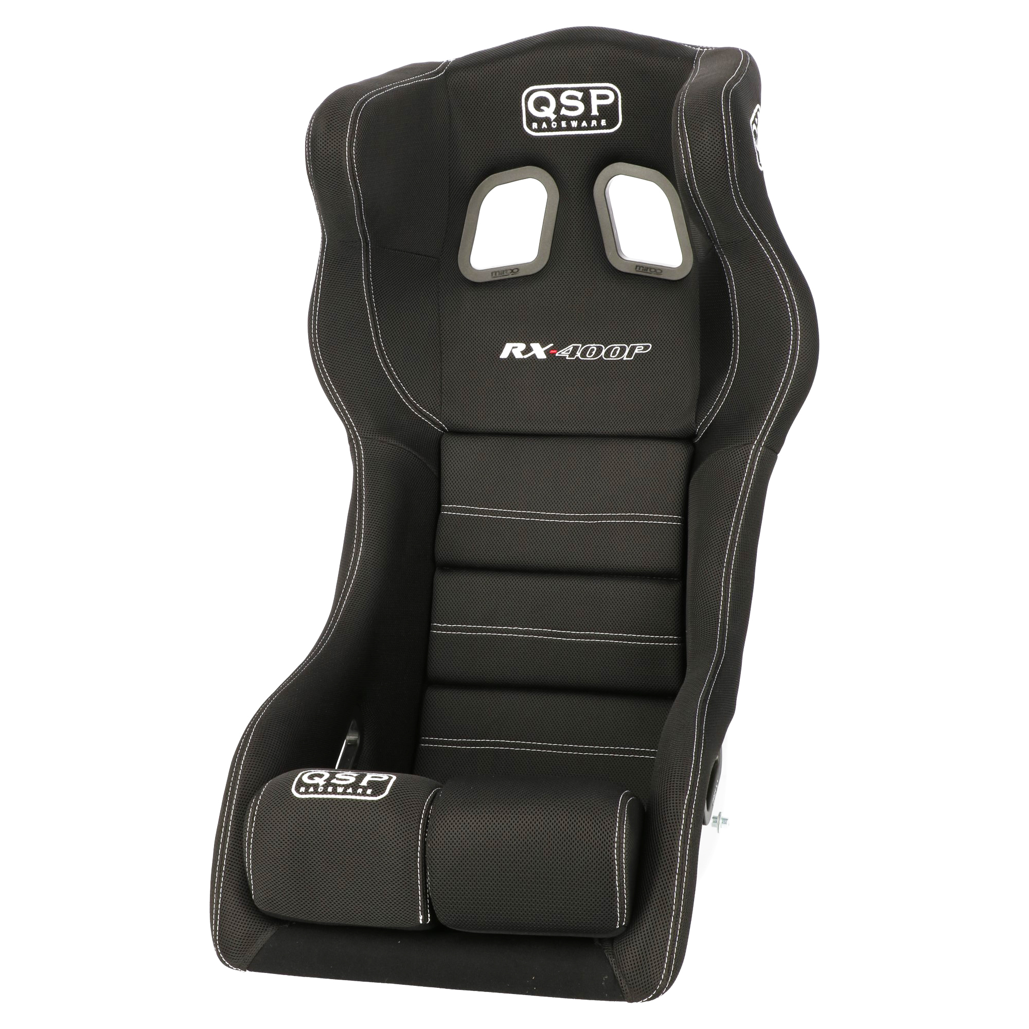 QSP racing chair FIA RX-400P QSP FIA approved racing chair, large model, with polyester shell with a beautiful glossy gel coating, covered with ventilating 'MESH' fabric. This RX-400P is equipped with head protection for optimal safety. The seat has 5 belt holes, suitable for 4-, 5- and 6-point belts. This sports chair is equipped with side mounting, suitable for all chair frames from QSP Products. Chair frames must be ordered optionally. Weight: 8.6KG. HANS® compatible. Product video