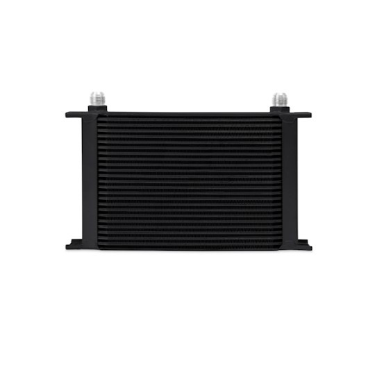 Every street or track vehicle demands a reliable and efficient cooling system. High oil temperatures accelerate oil degradation and can result in increased engine wear and potential failure of internal components. The Mishimoto universal 25-row oil cooler is the perfect upgrade for extending engine life and ensuring the proper lubrication of engine components while maintaining ideal oil temperatures. This oil cooler is nearly 2 inches thick and has an overall oil capacity of . 44 qt. The Mishimoto universal 25-row oil cooler is available in silver or black and includes the Mishimoto lifetime warranty.